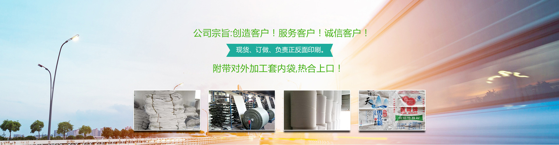 本公司常年生產(chǎn): 編織袋、彩膜、食品袋、集裝袋、飼料袋、化肥袋、水泥袋、化工袋、普危包裝袋、坯布專(zhuān)用內(nèi)袋、包皮、印染廠整裝專(zhuān)用包裝、有現(xiàn)貨、也訂做、負(fù)責(zé)正反面印刷。附帶對(duì)外加工套內(nèi)袋,熱合上口!聯(lián)系人:王經(jīng)理。 公司宗旨:創(chuàng)造客戶(hù)!服務(wù)客戶(hù)!誠(chéng)信客戶(hù)! 13256289338.17686389888